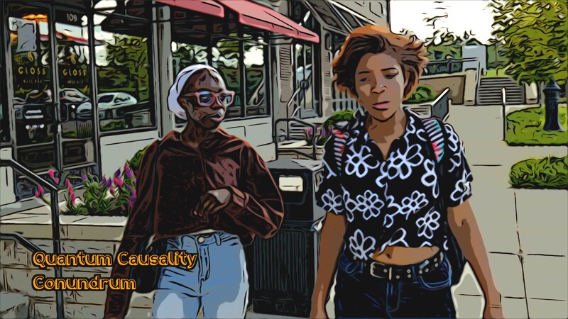 While walking back to a college campus, Emma and Lila delve into the nuances of quantum mechanics and causality, balancing profound curiosity with the practical need to get to class on time.